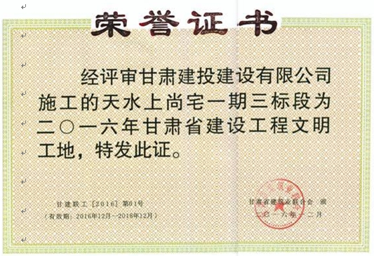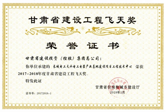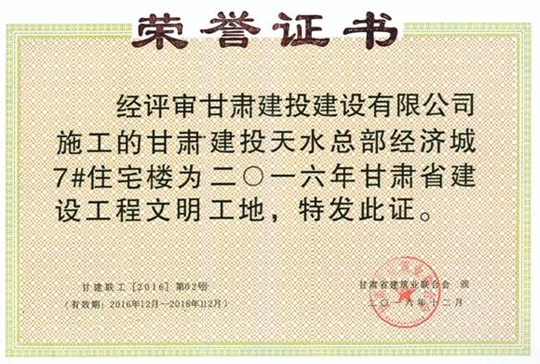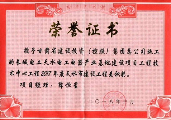 公司2015年度被中共甘肅建投建設(shè)有限公司黨委評為“先進(jìn)黨支部”榮譽稱號,2016年度被甘肅建投建設(shè)有限公司評為“先進(jìn)集體”榮譽稱號。天水總部經(jīng)濟(jì)城7#樓、天水上尚宅5#、9#樓被評為省級安全文明工地,中海河山郡二期23#、27#樓及相連地下車庫工程被評為“建設(shè)杯”二等獎,長城工程技術(shù)中心項目榮獲“麥積獎”“飛天獎”,長城電工中壓氣體絕緣廠房項目“大面積耐磨地坪結(jié)合鋼釬維混凝土施工”獲得省級工法。