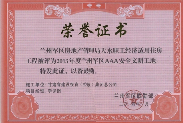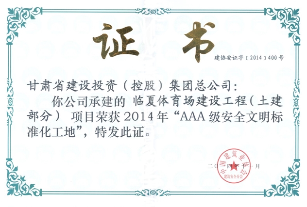 公司五年內(nèi)無(wú)死亡事故及無(wú)重大環(huán)境污染和擾民事件的發(fā)生,安全生產(chǎn)合格率100%,施工產(chǎn)值達(dá)到192707.82萬(wàn)元,竣工面積為1684836m2;臨夏市體育場(chǎng)項(xiàng)目榮獲“全國(guó)AAA級(jí)安全文明標(biāo)準(zhǔn)化工地”,蘭州軍區(qū)天水職工住宅樓項(xiàng)目榮獲蘭州軍區(qū)“AAA級(jí)安全文明工地”,甘肅省人民醫(yī)院住院部二期7號(hào)樓8號(hào)樓項(xiàng)目、東川棚戶(hù)區(qū)改造AD塊9號(hào)樓10號(hào)樓項(xiàng)目、古浪昌靈小區(qū)公租房項(xiàng)目榮獲甘肅省省級(jí)文明工地,西寧城市綜合管廊項(xiàng)目榮獲青海省安全標(biāo)準(zhǔn)化示范省級(jí)文明工地獎(jiǎng)項(xiàng) 。