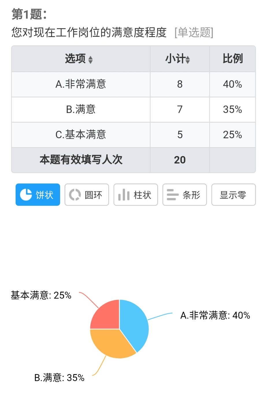 調研采用發(fā)放網(wǎng)絡問卷的方式,要求職工在線上進行填寫,共發(fā)放20份,收回20份,問卷內容涵蓋各科室、各年齡段以及不同性別,具有普遍性和代表性。通過網(wǎng)絡后臺統(tǒng)計匯總出的數(shù)據(jù),公司能夠比較全面且直觀地了解干部職工的思想狀況及其動態(tài)變化,包括對公司各項工作、對企業(yè)改革發(fā)展的真實想法以及對個人職業(yè)發(fā)展的規(guī)劃和在工作、生活等方面的迫切需求。