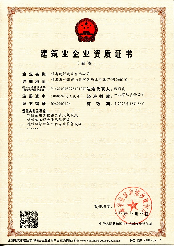 2016年以來(lái),建設(shè)公司成功取得建筑工程施工總承包和建筑裝修裝飾工程專(zhuān)業(yè)承包兩項(xiàng)一級(jí)資質(zhì),消防設(shè)施工程專(zhuān)業(yè)承包二級(jí)資質(zhì)。目前,公司還具有市政公用工程施工總承包、鋼結(jié)構(gòu)工程專(zhuān)業(yè)承包和建筑機(jī)電安裝工程專(zhuān)業(yè)承包三項(xiàng)二級(jí)資質(zhì);地基基礎(chǔ)工程專(zhuān)業(yè)承包一項(xiàng)三級(jí)資質(zhì)。