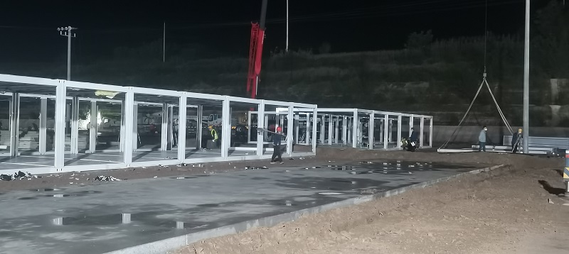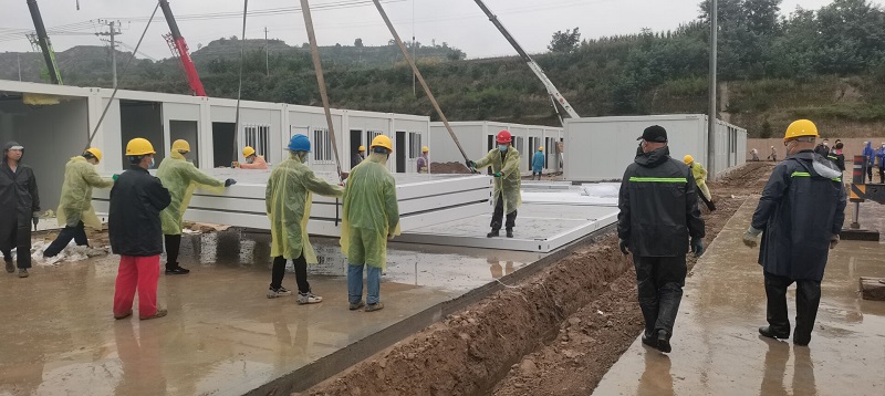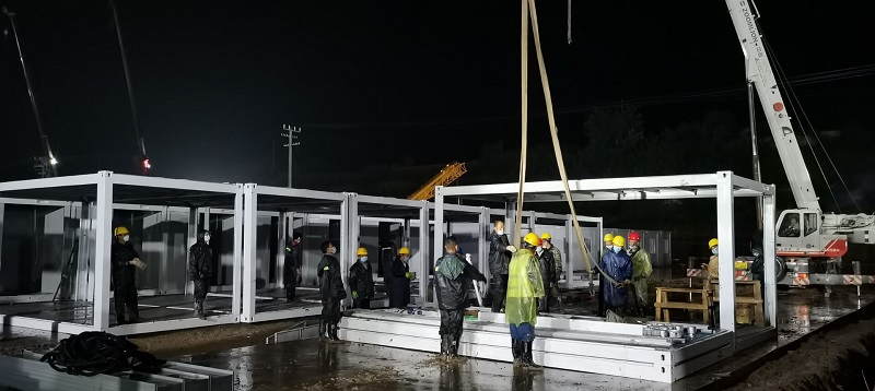 因疫情和連續(xù)降雨天氣,給施工造成一定困難,項目部全體人員風(fēng)雨里、泥濘中拼搏共進(jìn),分秒必爭,加快“逆行”腳步,顧不得休息,24小時不間斷輪班施工,全力以赴,統(tǒng)籌協(xié)調(diào)人力、物力、機械。截至目前已完成100間集裝箱的框架安裝和40套墻板安裝任務(wù),衛(wèi)浴設(shè)施及水電也在緊張施工過程中,剩余未完成工程量的材料已全部發(fā)貨,其他要素正逐項配齊。