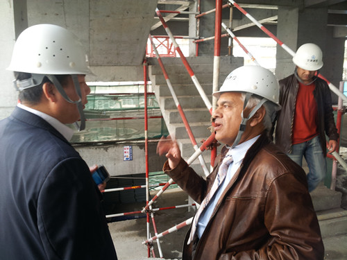 2013年4月20日,中甘國際沙特公司合作伙伴默罕默德.穆尼爾一行三人在中甘國際公司相關(guān)人員陪同下,參觀了我公司施工的建投3#樓施工現(xiàn)場。穆尼爾等參觀施工現(xiàn)場的安全防護(hù)、技術(shù)質(zhì)量等,對(duì)現(xiàn)場電梯井口的工具化、定型化防護(hù)措施及施工質(zhì)量驗(yàn)收標(biāo)牌上墻制度交口稱贊,同時(shí)也對(duì)該工程現(xiàn)場管理給予了高度評(píng)價(jià)。
