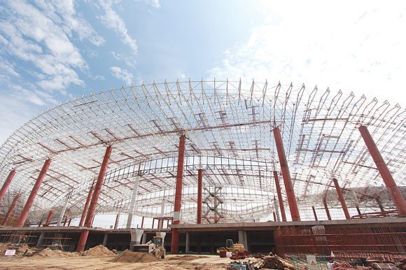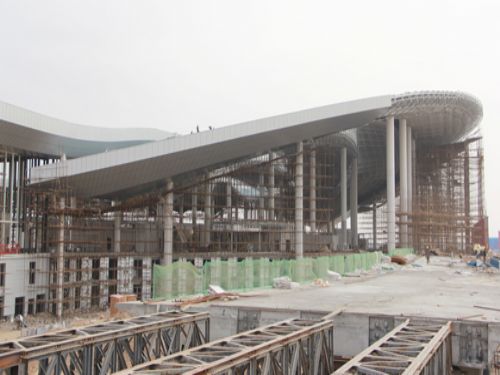 中川機(jī)場(chǎng)新航站樓施工現(xiàn)場(chǎng)最令人震撼的是巨大的網(wǎng)架,如雄鷹翱翔展開的羽翼一樣,縱深197米,橫展336米,姿勢(shì)優(yōu)美,氣勢(shì)壯觀。這是全省鋼網(wǎng)架面積最大、寬幅最寬的網(wǎng)架工程,在新工藝、新技術(shù)方面均有大的突破,很多施工技術(shù)是首次在我省的鋼結(jié)構(gòu)施工中使用,贏得了同行業(yè)的高度贊譽(yù)。中川機(jī)場(chǎng)新航站樓的網(wǎng)架工程,不僅展示了甘肅建投在鋼結(jié)構(gòu)網(wǎng)架方面的領(lǐng)先位置與實(shí)力,同時(shí)也為甘肅鋼結(jié)構(gòu)網(wǎng)架方面樹立了新的標(biāo)桿工程。