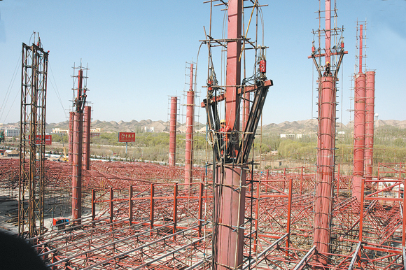 甘肅建投在該工程中使用了大量新產(chǎn)品、新技術(shù)、新工藝,力求打造精品工程,展現(xiàn)甘肅建投的實(shí)力與水平。項(xiàng)目技術(shù)負(fù)責(zé)人左心偉表示:“這項(xiàng)工程大梁為1.6×1.4米,荷載大,對(duì)設(shè)備料投入、支撐體系要求都非常高;而大跨度預(yù)應(yīng)力梁板、后澆帶、土建與鋼結(jié)構(gòu)交叉作業(yè)更增加了施工難度,技術(shù)復(fù)雜程度甘肅少見(jiàn)?!痹摴こ趟袖摻钊渴褂酶邚?qiáng)度的三級(jí)鋼,總重量為6000噸,確?!肮羌堋辟|(zhì)量。在土建工程中,采用了鋼管混凝土澆筑法,50根巨大的圓形鋼管共澆筑混凝土3千立方米,鋼管柱與框架梁鋼筋連接,焊接量非常大。鋼管混凝土與框架梁融為一體,大大提升了結(jié)構(gòu)的堅(jiān)固程度和安全性能。