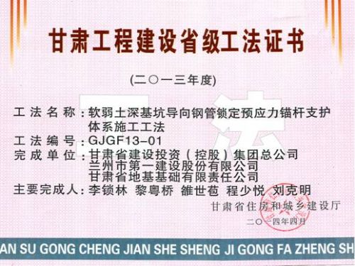 其關(guān)鍵技術(shù)于2013年7月12日通過了甘肅省住房和城鄉(xiāng)建設(shè)廳組織的由汪國烈、王旭等專家組成的專家委員會(huì)的鑒定,鑒定《濕陷性黃土地區(qū)軟弱土深基坑導(dǎo)向鋼管鎖定預(yù)應(yīng)力錨桿支護(hù)體系研究與應(yīng)用》達(dá)到國際先進(jìn)水平。
