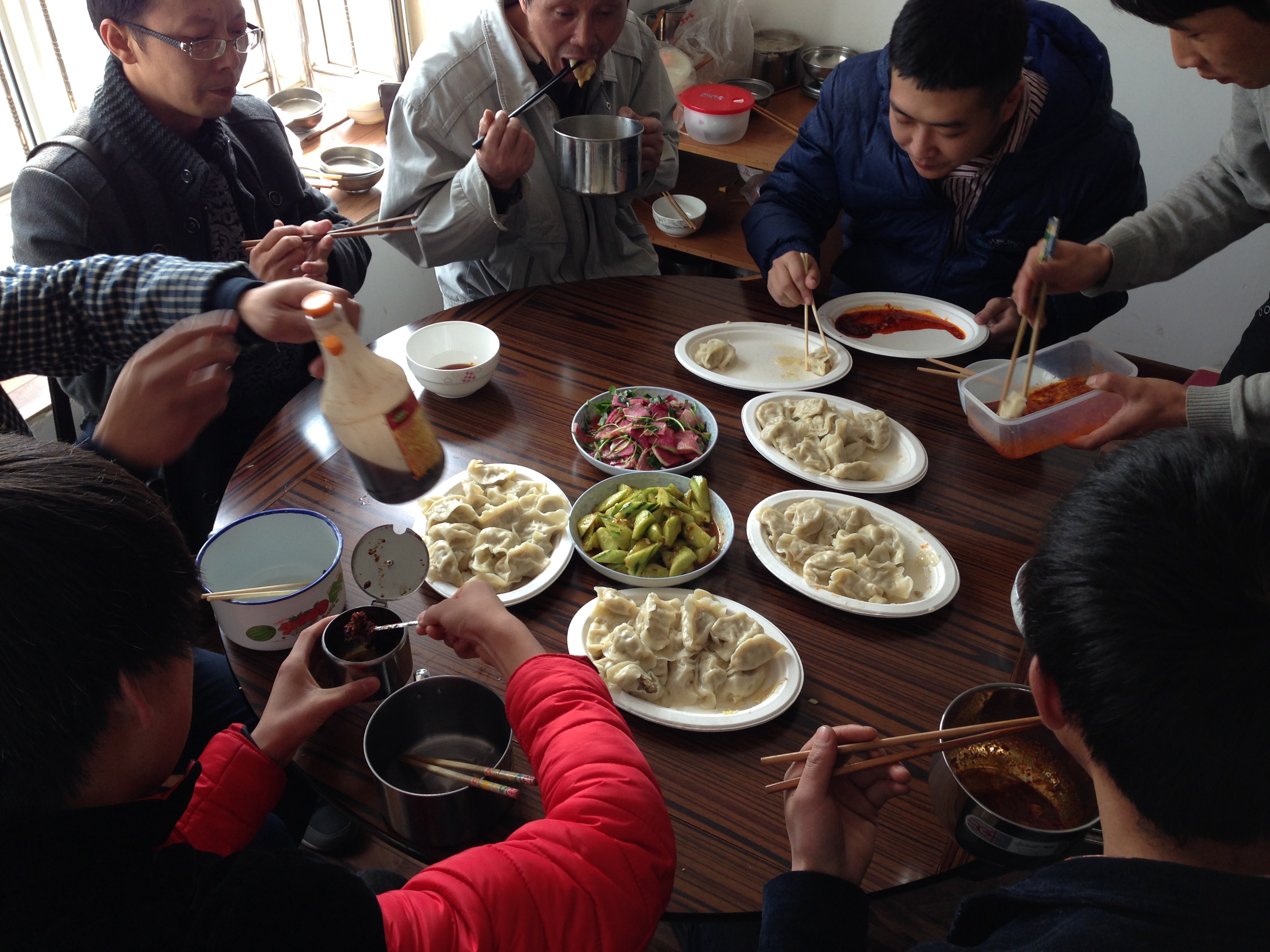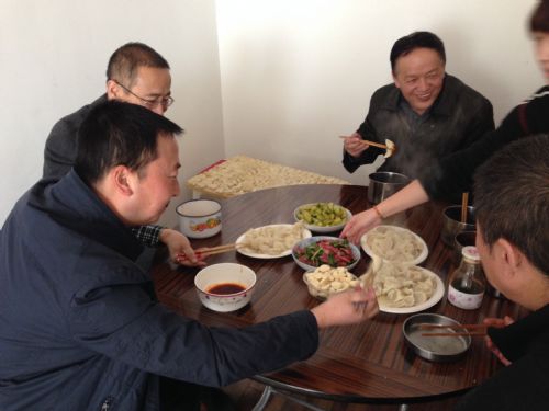 隨后,大家七手八腳,各顯神通的開始包餃子。經過一上午的辛苦努力,一千多個待下鍋圓鼓鼓的餃子終于包好了,回頭看看所有人,哪個不是白頭粉面的,但是藏不住的喜悅卻一直掛在臉上。午飯時間,項目部的同志們聽說包了熱騰騰的餃子,便一窩蜂涌向飯?zhí)?,大家爭先恐后的圍坐在飯桌前,大家顧不到欣賞,將各式各樣的餃子搶一個先塞進嘴里,不時連連贊嘆:“好香!因為工地人多,自開工以來還未吃過餃子,歡迎你們常來?!贝藭r我們幾個人之前的辛苦便不是什么了。