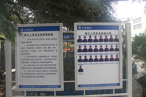 根據(jù)該工程項(xiàng)目確?!疤焖形拿鞴さ亍?、“甘肅省省級文明工地”的目標(biāo)計(jì)劃,項(xiàng)目部編制了具有針對性的、符合現(xiàn)場實(shí)際的文明施工規(guī)劃,確定文明施工標(biāo)準(zhǔn)。生產(chǎn)區(qū)、辦公區(qū)、生活區(qū)平面等布置,材料加工與堆放嚴(yán)格按施工現(xiàn)場文明施工規(guī)劃圖實(shí)施。同時(shí)結(jié)合項(xiàng)目部實(shí)際嚴(yán)格落實(shí)甘肅建投企業(yè)“VIS”視覺識別系統(tǒng),對門頭、企業(yè)宣傳用語、宣傳欄、管理人員和作業(yè)人員工作服、安全帽、胸牌,辦公用品等都進(jìn)行了統(tǒng)一規(guī)范。