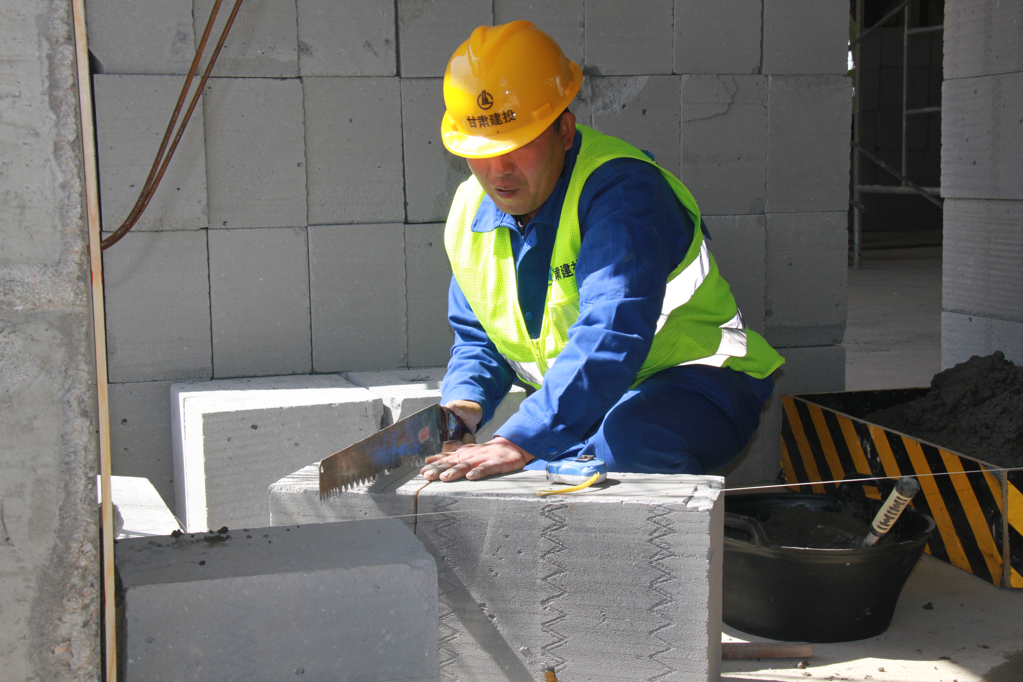 隨后的比賽中,對全體參賽選手進(jìn)行質(zhì)量交底和安全交底后依次進(jìn)行了理論考試和實作競賽。現(xiàn)場切割機長鳴,敲打聲此起彼伏,運送著砂漿的拉斗車在飛快穿梭,被熟練操縱的砌磚刀有序地?fù)]舞著,一次次放線、測量,一次次抹灰、敲打,奏響了速度與質(zhì)量的壯美交響樂。此次競賽的砌體水平灰縫厚度及豎向灰縫寬度均為15毫米內(nèi),正、反面墻面均宜進(jìn)行勾縫,對參賽選手的起評分提到了一個新高度。也不見砌筑中常見的吊線錘,選手都是自帶激光水平儀,現(xiàn)場上紅線、綠線縱橫交織,感覺又現(xiàn)代又高級,充分展現(xiàn)了競賽推動建設(shè)知識型、技能型、創(chuàng)新型勞動者大軍,弘揚勞模精神和工匠精神的活動內(nèi)涵。