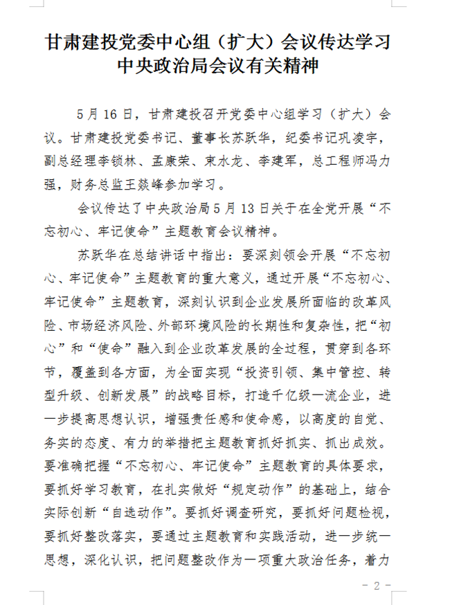 【不忘初心 牢記使命】甘肅建投黨委中心組(擴大)會議傳達學習中央政治局會議有關精神