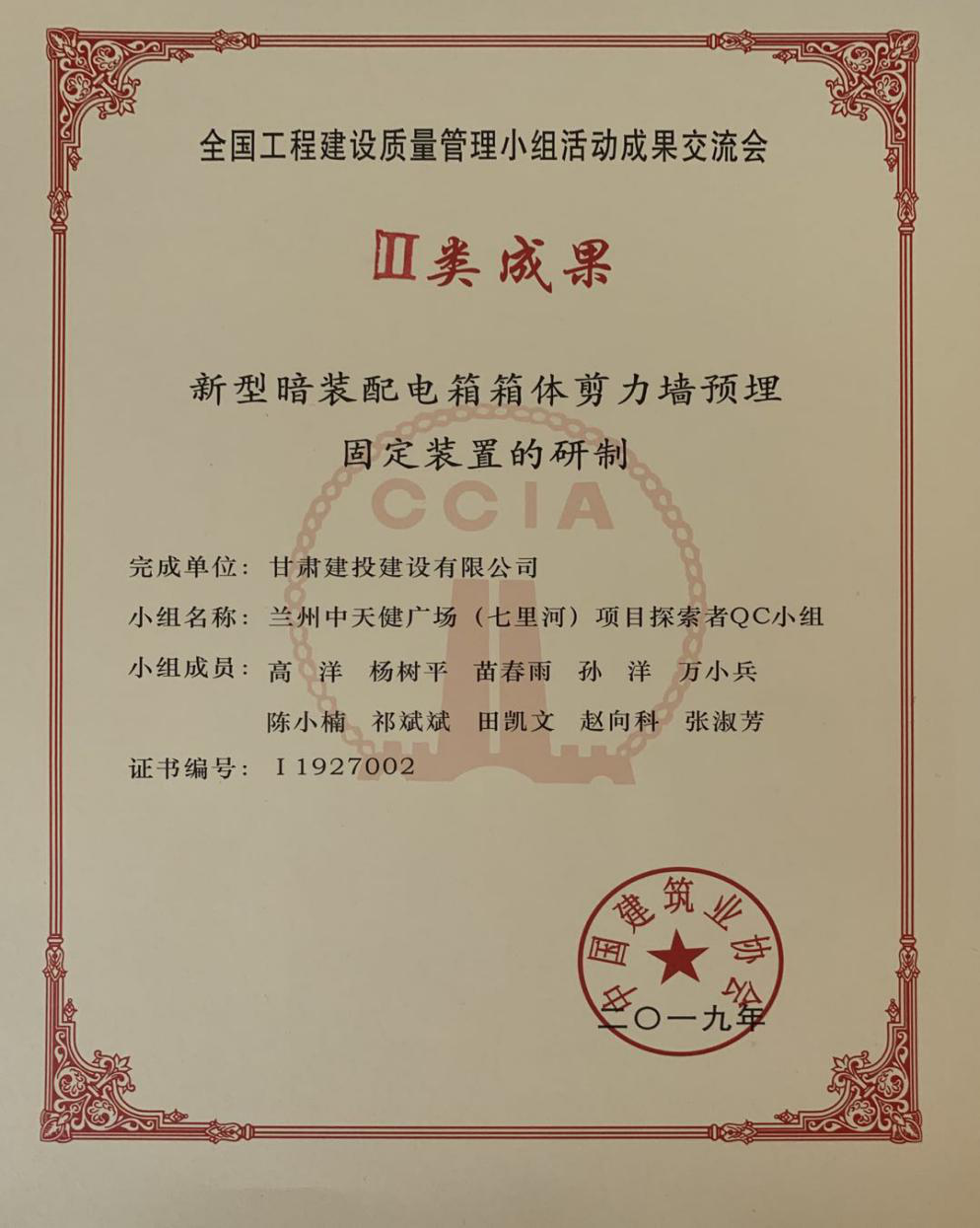 建設(shè)公司QC成果獲2019年度全國工程建設(shè)質(zhì)量管理小組成果交流會Ⅱ類成果